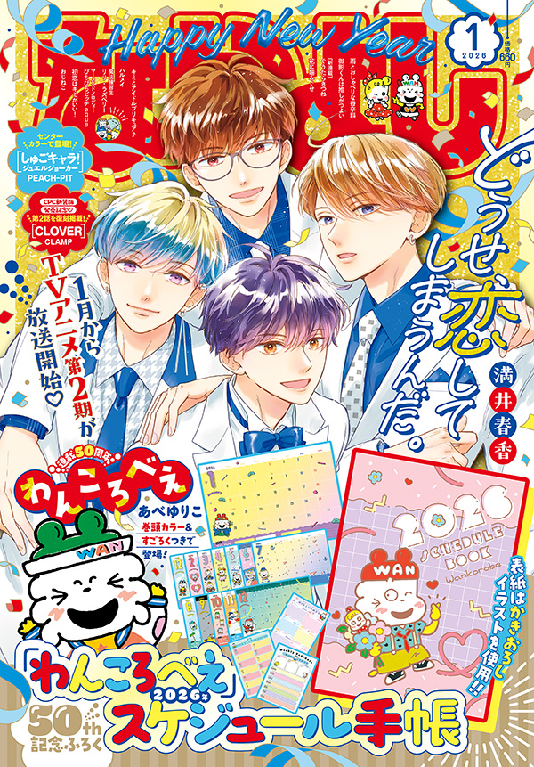 なかよし1月号はパーティー感 満載! なんとなんと…みんな大好き「わんころべえ」が連載50周年を迎えます!! ふろくは『わんころべえ』50th記念ふろく 2026年スケジュール手帳! 超キュートでポップなデザインは「わんころべえ」ならでは★ これからもずっとなかよし♪ そして2026年からTVアニメ第2期が放送開始の『どうせ、恋してしまうんだ。』が表紙で登場!! TVアニメが始まる前に最前線で推しちゃおう! さらに続々重版で絶好調の『花に噛みぐせ』、『しゅごキャラ! ジュエルジョーカー』も掲載です♡ たっくさんハッピーが詰まった1月号、お楽しみに!